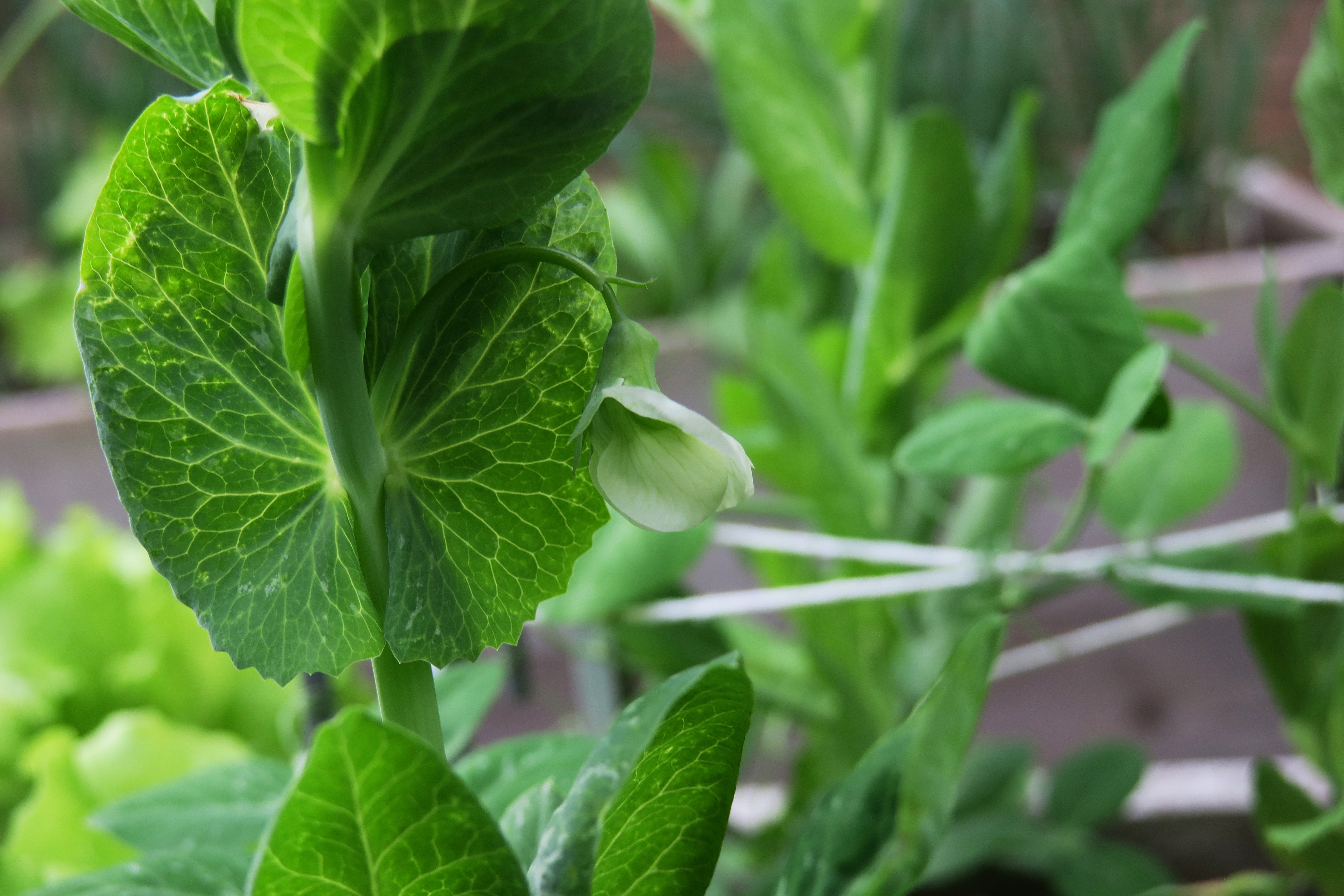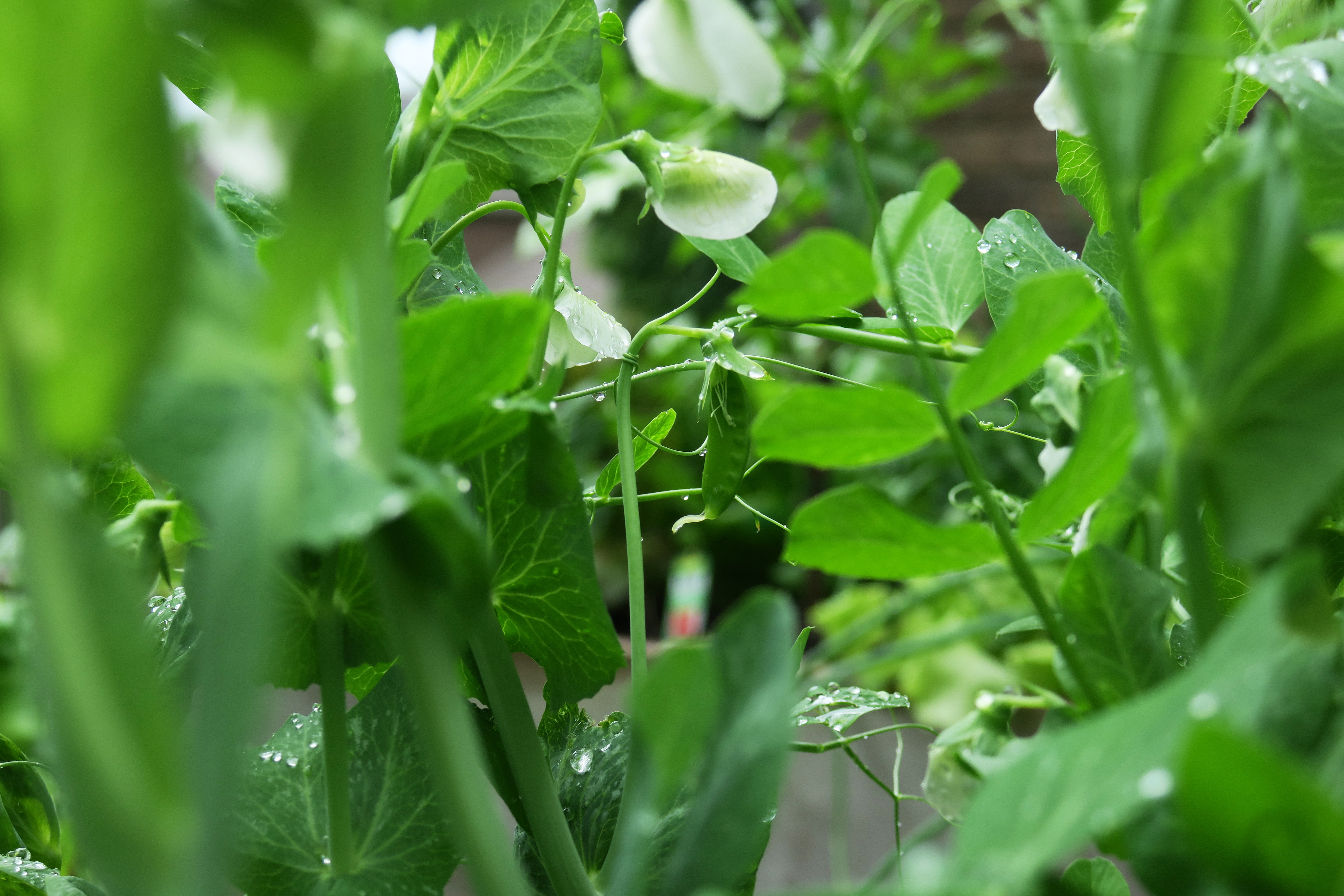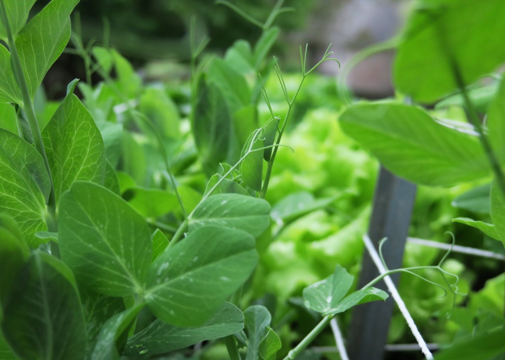 A couple days (May 3) after this original post, I went outside to find one bloomin’ pea. One week later, a pea pod was growing in the rain. Yesterday (May 14), I had several pea pods and many blooms.
