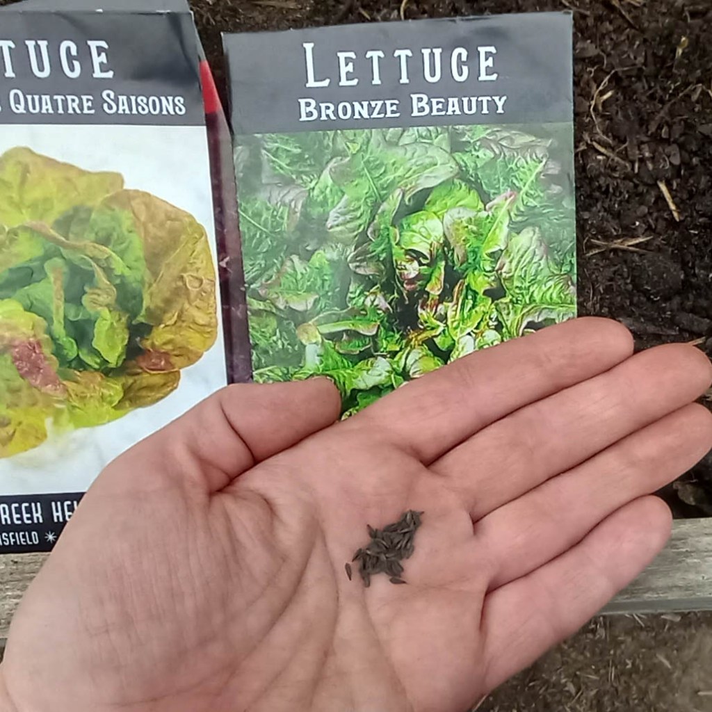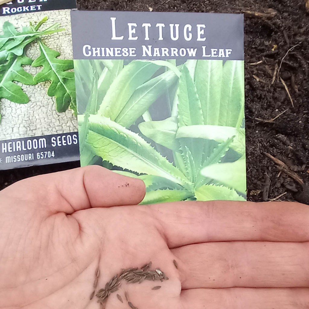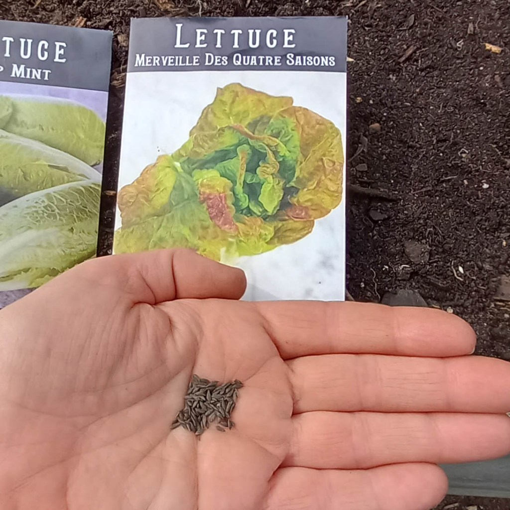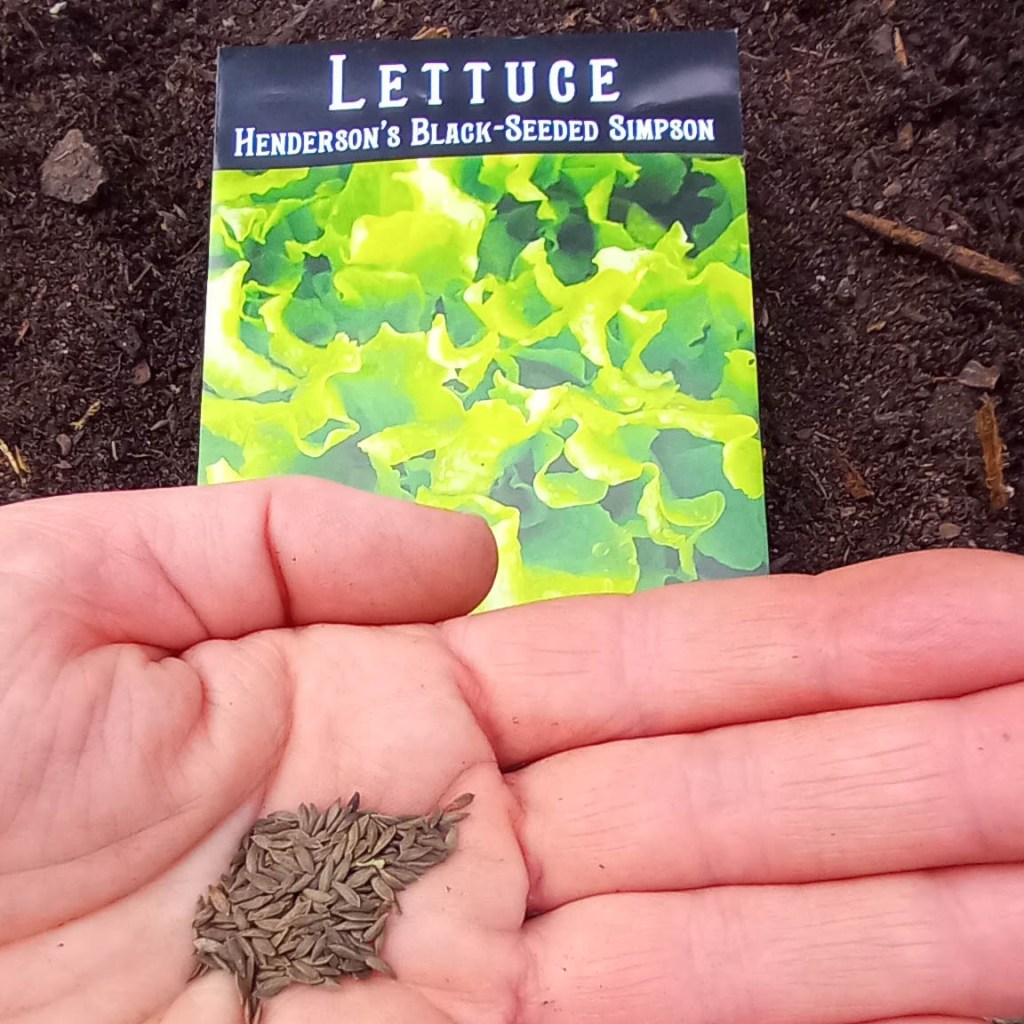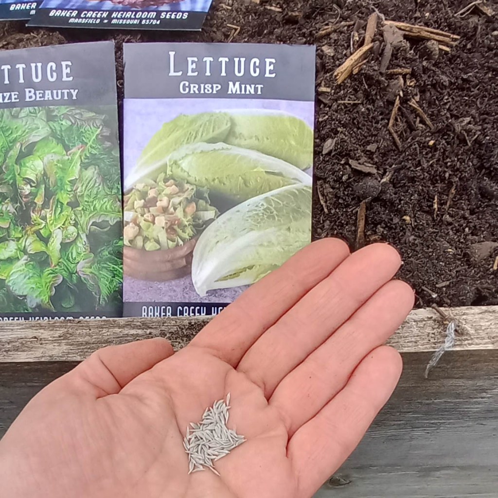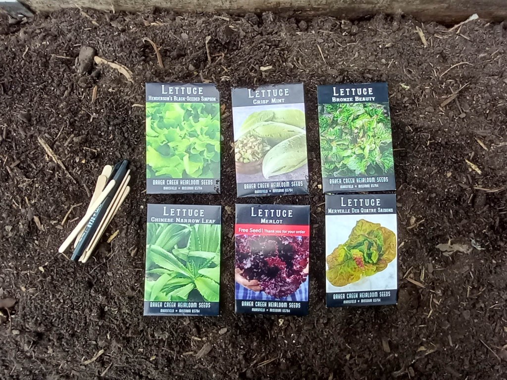— Today, I planted lettuce in grow-cut-grow-cut rows, so I scattered seed rather than carefully spaced seed. This year’s varieties: “Henderson’s Black-seeded Simpson,” “Crisp Mint,” “Bronze Beauty,” “Chinese Narrow Leaf,” “Merlot” and “Merveille Des Quatre Saisons;” Shoutout to Baker Creek Heirloom Seeds for the free gift of “Merlot.”
